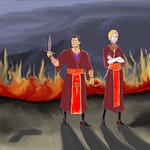 She fired two more shots into the surface of the table and was rewarded with a cry of pain that made her laugh again. She loved hearing the moans of the dying man outside, the rattling clink of her shell casings on the stone floor, the mournful cries of the man on the other side of the table. To her left she felt courage and leaned back to dodge a lunging thrust with a bayonet. The person who had come out of the little cubby with the stove looked incredibly surprised that she had detected him, but not as surprised as he looked when the Oathkeeper swung her hammer around into his right arm so hard that with a gristly crack it bent inwards and broke the stock off his shotgun. Strawberry blonde hair flashed in his eyes for a split-second before he took a kick to his midsection that sent him tumbling backwards onto the stove, which rocked back and then forth again, dumping hot coals into his shins. A fire started to catch the fur hem of his shearling coat, but what really hurt was the glowing coal that slipped into the ankle of his boot and was trapped against the arch of his heel. Screaming through grit teeth, he tried to pull himself up with his remaining good hand clutched around the front of the shotgun while Placelle Lamella dropped the empty magazine from her pistol, and upon seeing the magazine fall out he desperately fought the pain long enough to choke back on the shotgun still in his left hand in hopes he could get a finger into the trigger guard.